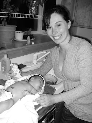 her first bath (old school in the kitchen sink)...