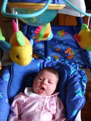 Here's Claire relaxing in her new 6-speed aquarium swing from Uncle Pete, complete with lights, music, and a fish mobile...