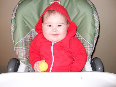 She has finally out-grown this red hoodie but I used to love her in it. This is back when hanging out in the high-chair playing with toys was still cool. My how we miss those days!