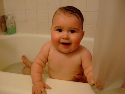 Bath-time cutie! Bath-time is one of Claire's favorite things. She loves playing in the water with her toys and filling and emptying cups. She still has the adorable arm rolls, I can never get enough of those babies...